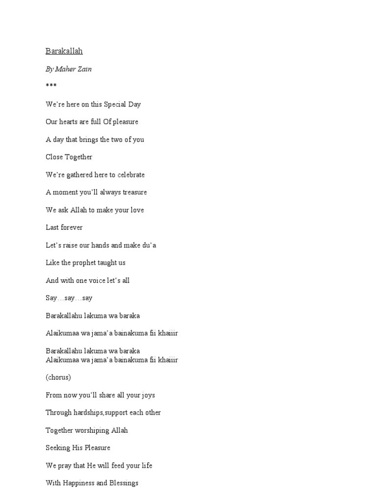 Dan dengan satu kata ayo semua berkata. Dan itulah saat kau membuka pintu untukku. Thank you allah | maher zain. Barakallah hu lakuma wa baraka alikuma. Barakallah hu lakuma wa baraka alikuma barakallah hu lakuma wa . From now you'll share all your chores. Barakallah hu lakuma wa baraka alikuma Wa jamaah baina kuma fii khair. Kumpulan lagu maher zain barakallah lirik terjemahan full album. Download lagu maher zain barakallah lirik terjemahan mp3 dan mp4 di travelagu 7.31 mb. Barakallah hu lakuma wa baraka alikuma. Wa jamaah baina kuma fii khair. Wa jamaah baina kuma fee khair.